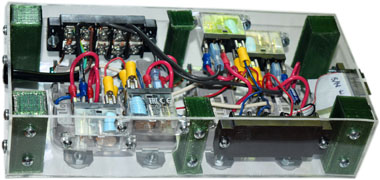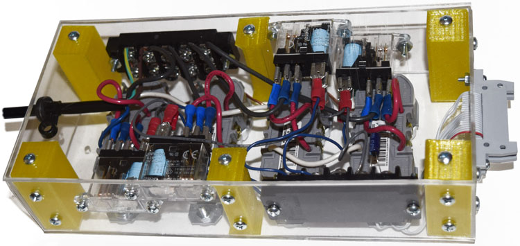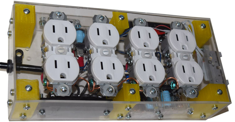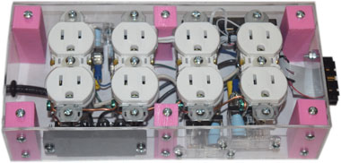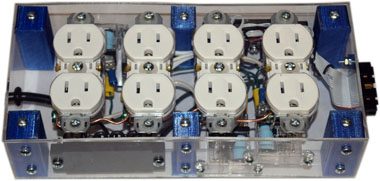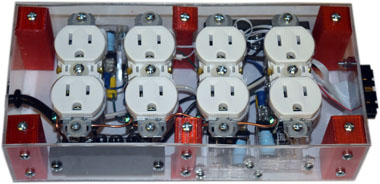 | This 8-outlet, relay controlled, custom power-strip, lets you to turn 120v AC devices On and Off using the four annunciator outputs of the apple II game port (with a little help from our Game Port Interface Board). We demonstrated this control box on Friday, July 21 at KansasFest - see the video at https://youtu.be/A3YVujz1a0Y. You can see how the box works through the clear plexiglass. Yes, we used 5v DC relays to isolate the 120v AC from the apple. So, no 'oops' on the power side will have an adverse effect on your vintage apple hardware. |