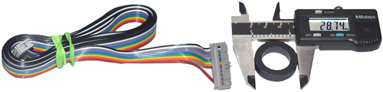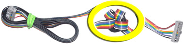 | FULL DISCLOSURE: we tested the 120vAC box on a IIgs, Platinum //e and //e - all tests worked fine with the supplied 5 ft, 10-conductor flat ribbon cable. Thanks to Vince Briel, our tests with a ][+ demontrated that we needed to 'quiet' the signals, so, we recommend putting the ribbon cable through a ferrite toroid see images below. |