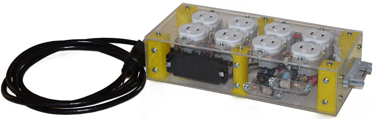 | This 8-outlet, relay controlled, custom power-strip, lets you to turn 120v AC devices On and Off using the four annunciator outputs of the apple II game port (with a little help from our Game Port Interface Board). We demonstrated this control box on Friday, July 21 at KansasFest - see the video at https://youtu.be/A3YVujz1a0Y. You can see how the box works through the clear plexiglass. Yes, we used 5v DC relays to isolate the 120v AC from the apple. So, no 'oops' on the power side will have an adverse effect on your vintage apple hardware. |