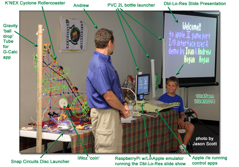 circuits. With this hurdle crossed, the rest of the adventure seemed to fall into place by itself. When his school had a Science Fair, Ivan decided to incorporate his ability to program with his ability to 'build stuff'. He build a tube that could sense when an object was passing through it at 3 specific points. Although Andrew built the photo-detection circuits, the rest of the project was all Ivan: from getting equations of motion out of a physics book, to writing the code for the app, to running tests, to compiling results and putting them into together on his poster board. The school district's Sping 2012 EXPO offered another opportunity to program and build stuff, only this time without the constraints of the scientific method. This time it was all about putting together something cool. In this case cool was fitting the K'NEX Cyclone Coaster (Christmas Gift) with sensors to know when a car was at the top, and, modifying the motor so it could be turned ON/OFF via relay & external power; then, adding sound effects, flashing lights, a spinning motor, a disc launcher and a motion detector (all care of Snap Circuits). And, then, controlling it all from the Apple //e. That following summer Andrew, Ivan & Ivan's sister built a 2-Liter Bottle launcher from PVC available at the local hardware store. Ivan decided that controlling it from the computer would be more fun than the original 3 button controller. In Fall 2012 we moved, so, winter & spring 2013 didn't afford much time for Apple //e related adventures. We missed K-Fest 2013 which was attended by iWoz. When we decided to attend K-Fest 2014, we revived all the projects, sprinkled-in some new ones and that's how it all came together. |