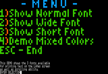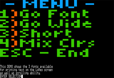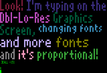 | This independent app allows the user to plot text characters on either the Lo-Res or Double-Lo-Res screen. Written in and assembled by the "ProDOS EdAsm r1.1 01-May-85" assembler; last revised 5/20/2014, it occupies memory $5000 - $637C, which includes the built-in demo. |