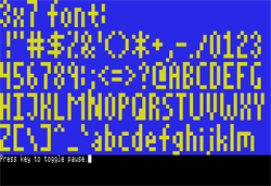 | Although you can set the parameters and then call the desired plot routine, the app was designed to work with a stream of characters, including control characters that set the parameters for you. That is how Demo#2 works. For example, you can type [Ctrl]-Q to clear the screen, then [Ctrl]-F followed by 1 (to select font #1), then [Ctrl]-A followed by 4 (to pick the color green) and then you can start typing away (see control codes below): If you just pass a stream of characters, then you only need to set a character value at $5014, then call the plotting routine at $5015. It's that simple! |