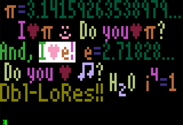 | If you run the GRPC.DEMODBL program, you can see both the plotting app and the screen wipe app working. You can also pick apart the BASIC code to see what memory locations are used for passing parameters.This web page focuses on the plotting app. The screen wipe app is described in more detail on the Dbl-Lo-Res screen wipe effects web page. When you BRUN the GRPCDBL.0 app, it sets up the Ctrl-Y vector and does a brief, one page demo in dbl-lo-res. After the Ctrl-Y vector is set up, you can CALL -151 to the system monitor, then press Ctrl-Y [Enter] to launch the 2nd built in demo. This demo allows you to type to either lo-res or dbl-lo-res, depending on which flags are set. By default, the dbl-lo-res flags are set. |